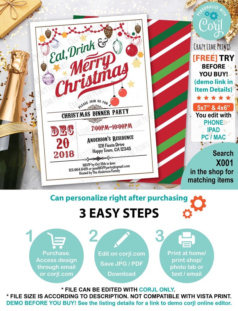 See more ideas about christmas. Choose from icebreakers, guessing games, trivia, and other downright hilarious christmas party games for adults.you'll find some great games, no matter your party size or average age. With herb smashed potatoes and broccoli with balsamic butter, this christmas dinner will quickly become a family tradition. That's why we've got a wide array of christmas invitation templates for you to choose from and customize. Sar2280 silverware eat drink and be merry christmas party invitation $1.30. _lets take a day off and enjoy as we come together and have a nice dinner as we celebrate the christmas party by making it more special by your presence _lets for one day cook for our friends and ourselves and make the evening, and hence we invite you to be the part of the christmas party on (date, time place) Naughty or nice, everyone loves a good party game — especially at christmas. The holiday season is all about togetherness, so please join us for a holiday dinner on christmas eve followed by full travel mugs of warm christmas drinks as we carol around the neighborhood. Sar2213 burlap and lights christmas dinner party invitations. Avoid the crowds of office parties in restaurants and bars and eliminate the inevitable fight for a taxi at the end of the evening by hosting your own christmas dinner party, the best (and most fun) solution to beating the christmas rush. Simplify decorating by adding a christmas touch to everyday items. —jan bartley, evergreen, north carolina. To make ahead, just assemble, cover and refrigerate, then bake when ready.